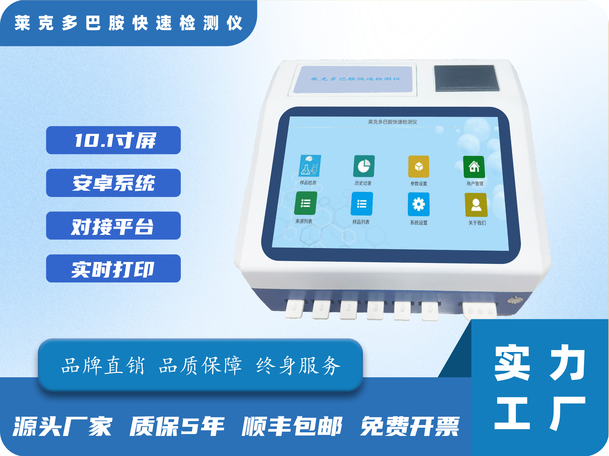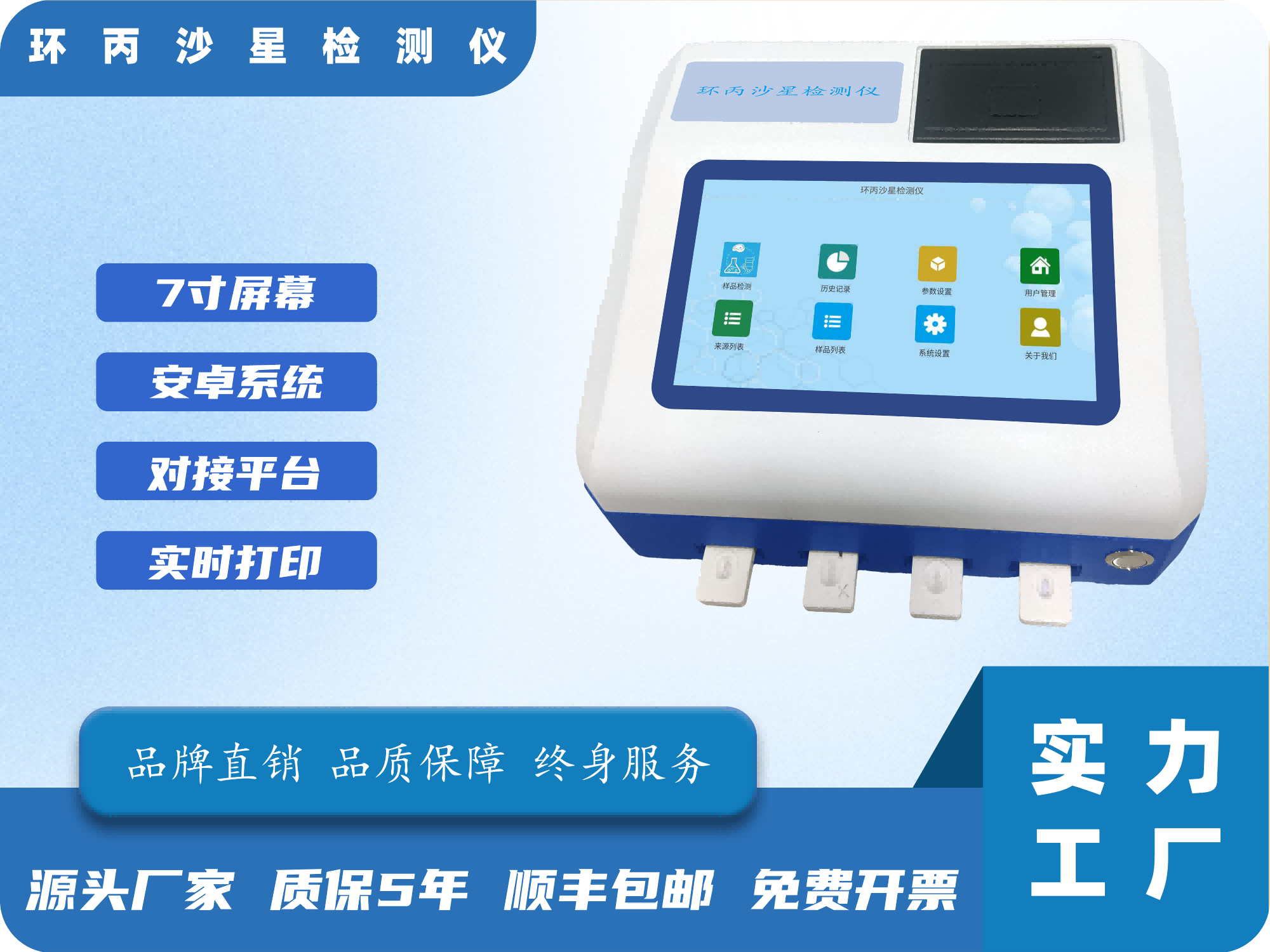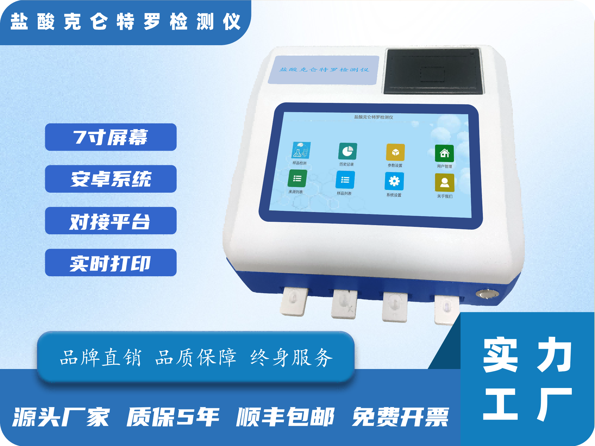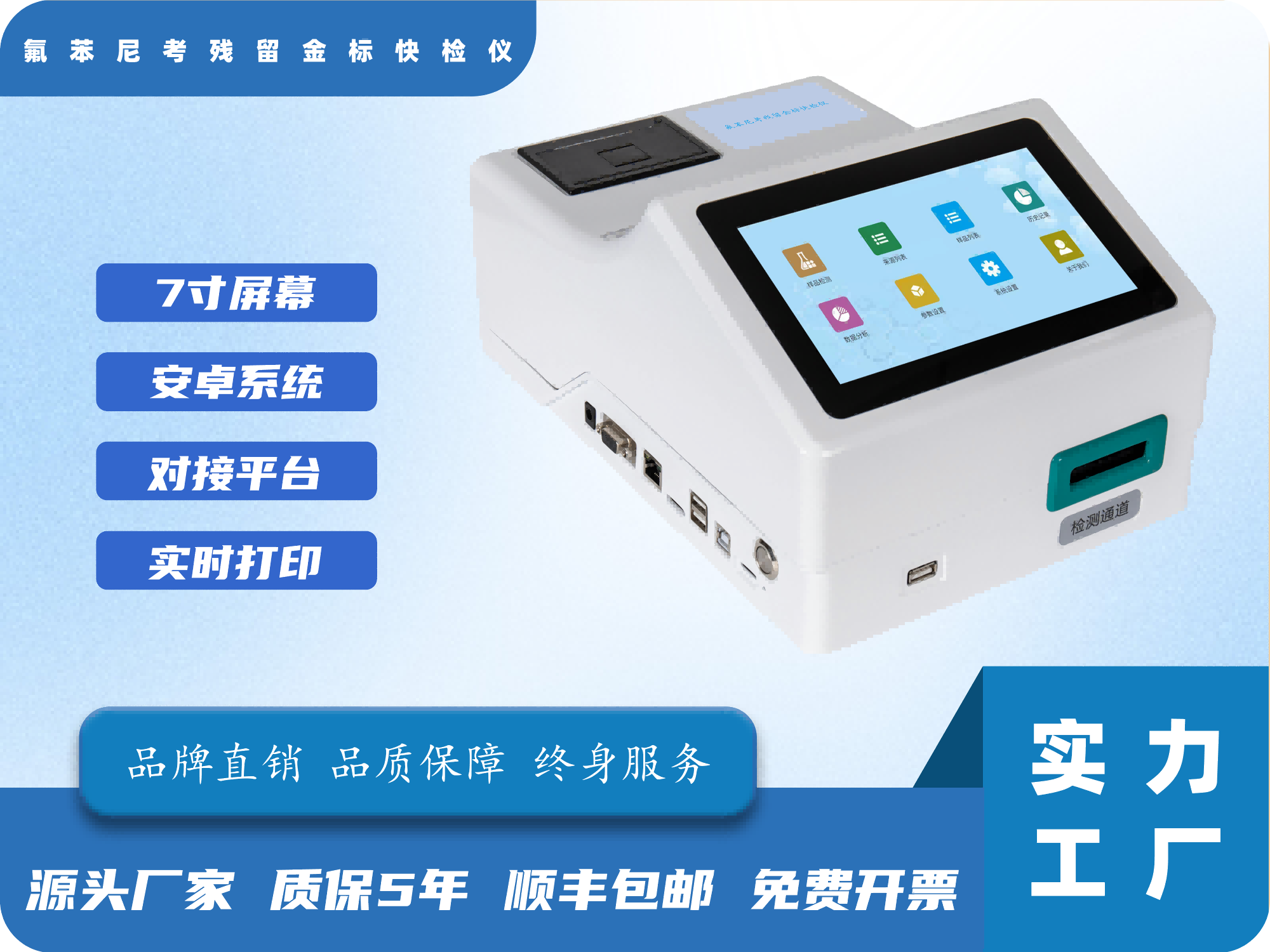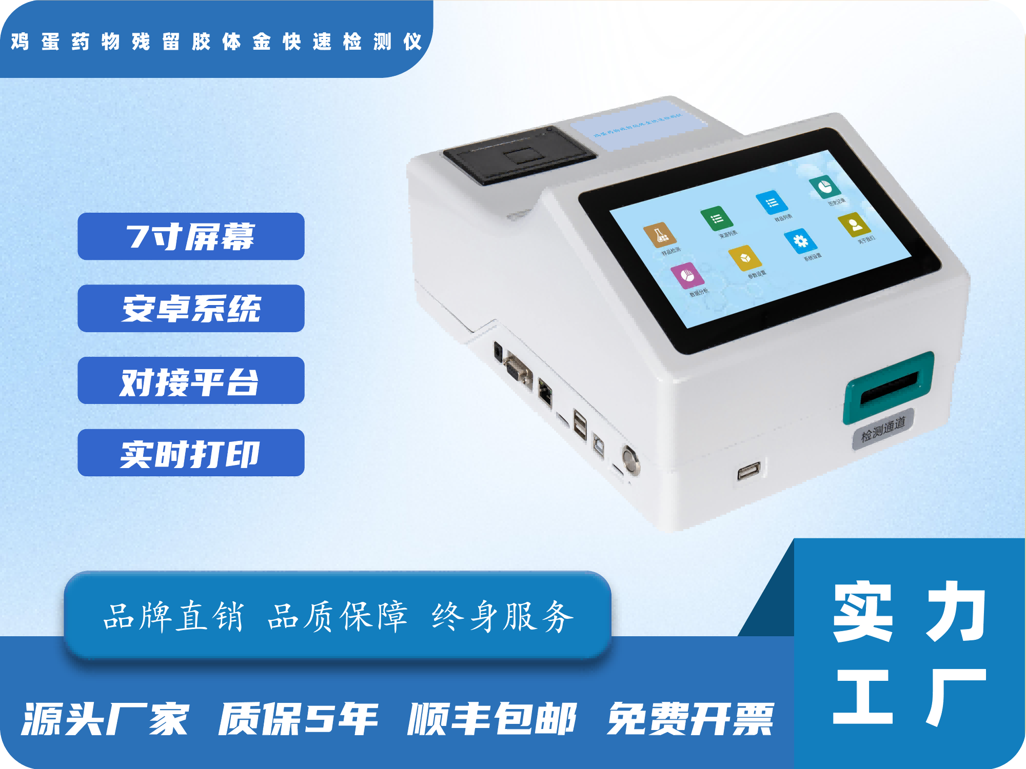 食品药品胶体金分析仪湖北泓森凯HSK-CG-0701T食品药品金标快速读卡仪能够快速检测肉类、乳制品、水产品、蛋类、水果蔬菜等样品中的兽药残留(如:呋喃类、孔雀石绿、四环素类、磺胺类等抗生素残留)、瘦肉精(如:克伦特罗、莱克多巴胺、沙丁胺醇)、农药残留(如:克百威、噻虫嗪、吡虫啉、啶虫脒、腐霉利等农药)。