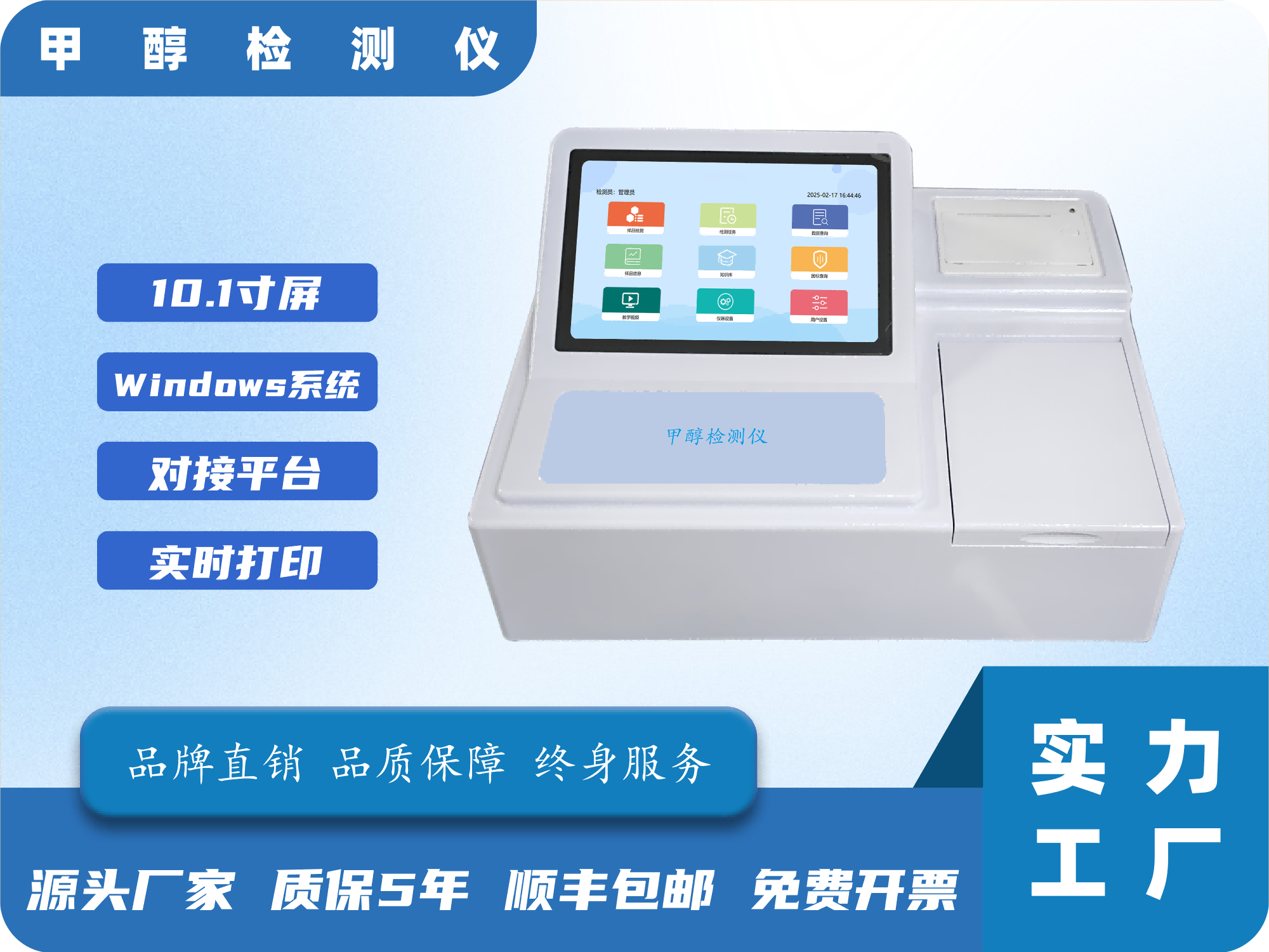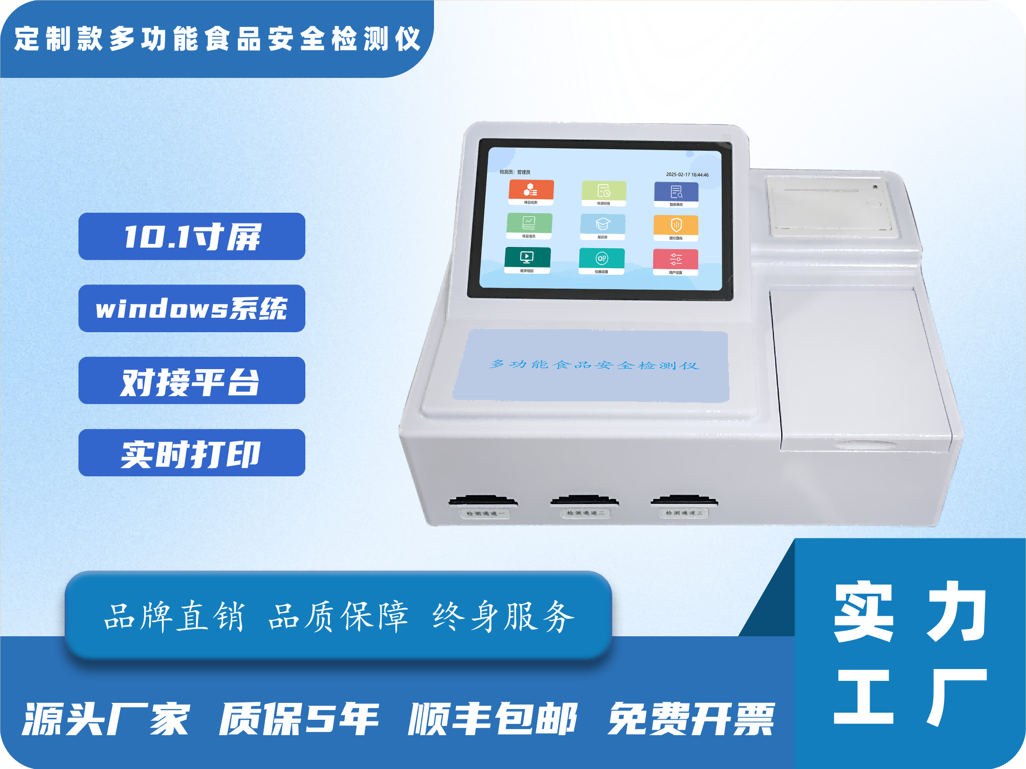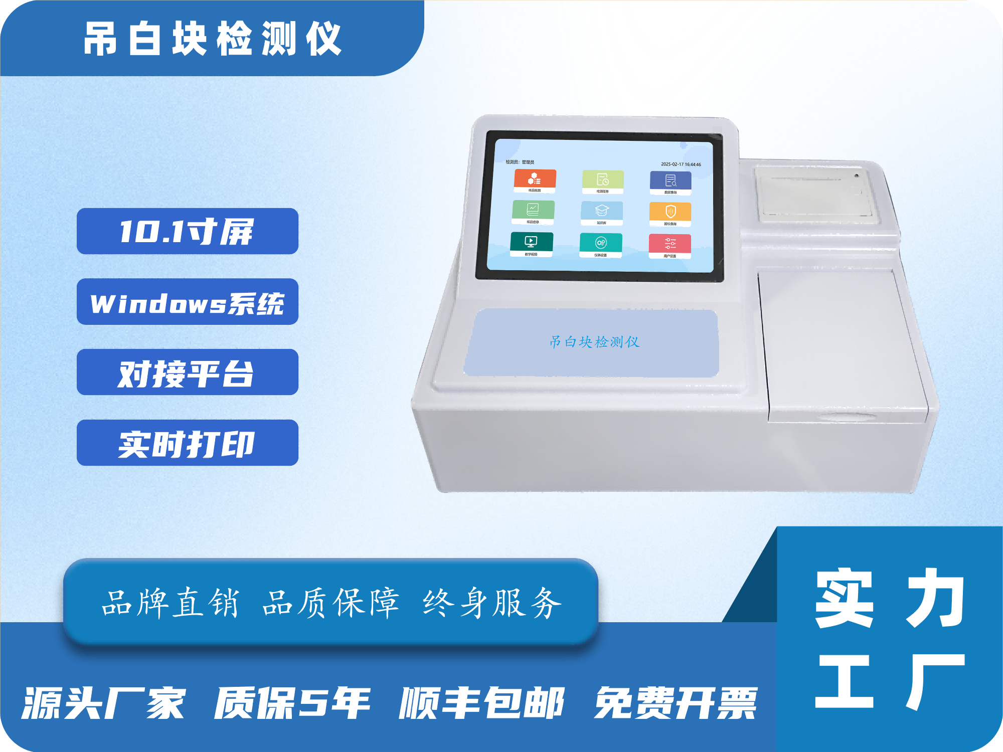 11、打印功能:内置80mm热敏打印机,单条或多条数据合并打印,打印信息包括名样品信息、用户信息、检测信息等,具备多种打印模式可选(标准打印、精简打印、合并打印)